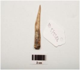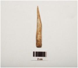 | Description / विवरण | Point made on bone with polished surface, rectangular in section, pointed towards one end, flat and broad at other end, vertical groove on one surface, partly broken one lateral side. |