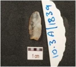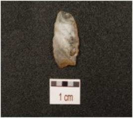 | Description / विवरण | An end struck flake made of quartz, prepared platform on proximal end and triangular cross section. |