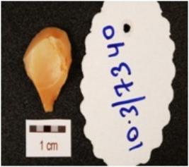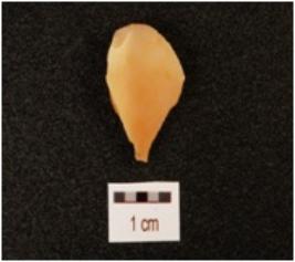 | Description / विवरण | A flake, made on chalcedony with flake scars on dorsal side and smooth ventral. |