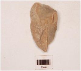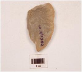 | Description / विवरण | A quartzite end struck utilized flake, prepared platform, prominent bulb on ventral side, plano convex in cross section and use-wear marks along the cutting edge. |