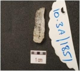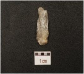 | Description / विवरण | A utilized flake made of quartz, prepared platform on proximal end, use marks on working edges and triangular cross section. |