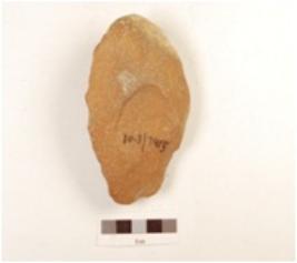 | Description / विवरण | A handaxe made on pebble quartzite, butt and convex surface, flake scars on both side plano-convex section and blunt cutting edge. |