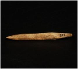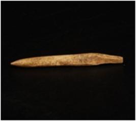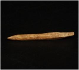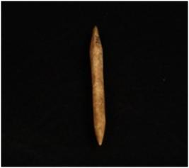 | Description / विवरण | A bone point with pointed ends, among the two pointed ends one end is broken and other end is intact, ridge along one end, polished surface. |