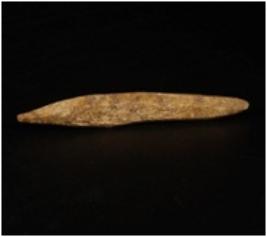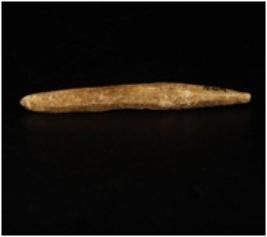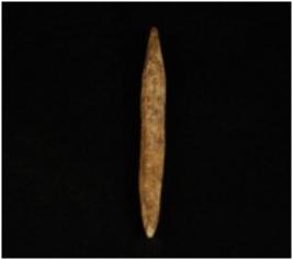 | Description / विवरण | A bone point with pointed ends, among the two pointed ends one end is broken and other end is intact, ridge along one end, polished surface. |
