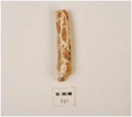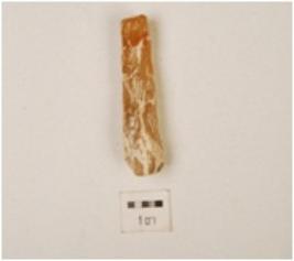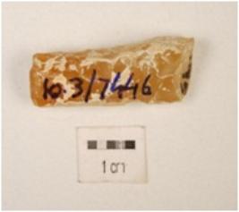 | Description / विवरण | Chert core with flake scars on surface, striking platform and circular cross section. |