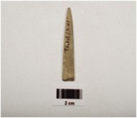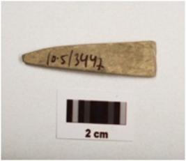 | Description / विवरण | A fragment of a stone point, one side pointed end another side broken, rectangular cross section, light grayish in colour with smoothly polished surface. |