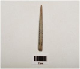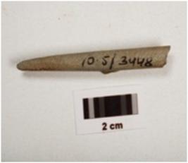| Description / विवरण | A stone point with smoothly polished surface, one end pointed and other broken circular cross section grayish smoky colour. |