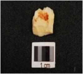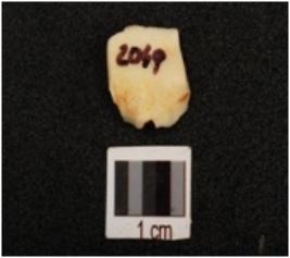 | Description / विवरण | Fragment of chert blade with a mid ridge, bulb on ventral, use wear marks on cutting edge and triangular in section, broken along distal end. |