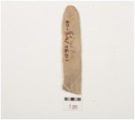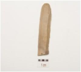 | Description / विवरण | A parallel sided chert blade with double ridge on dorsal, trapezoidal cross section, diffused bulb on ventral, use wear marks on cutting edge and broken along distal end. |