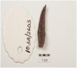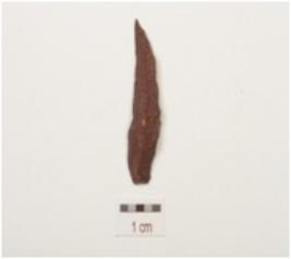 | Description / विवरण | A chert backed point with prominent mid ridge on dorsal, triangular cross section, pointed along distal end and use wear marks on one lateral working edge. |