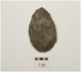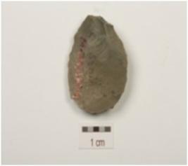 | Description / विवरण | A chert scraper with flake scars on surface, prepared platform and irregular retouches on working edge. |