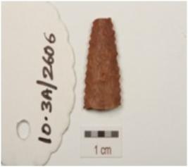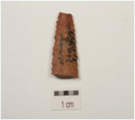 | Description / विवरण | Fragment of arrowhead made of chert, partly broken head, saw like edge and lenticular cross section. |