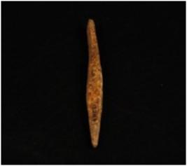 | Description / विवरण | A bone point with pointed ends, among the two pointed ends one end is broken and other end is intact, ridge along both the ends, polished surface. |
