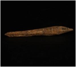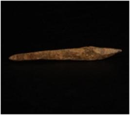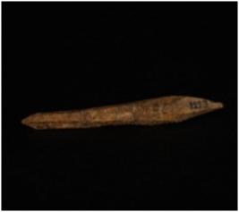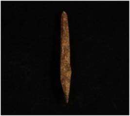 | Description / विवरण | A bone point with pointed ends, among the two pointed ends one end is broken and other end is intact, ridge along both the ends, polished surface. |