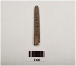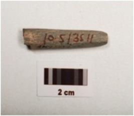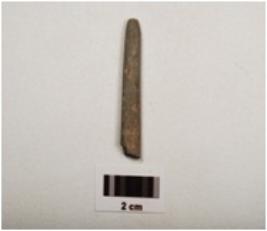 | Description / विवरण | A fragment of a point stone tool broken both ends, grayish in colour, slightly chipped off surface, rectangular cross section. |