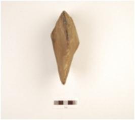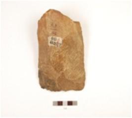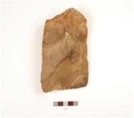| Description / विवरण | A cleaver made on quartzite pebble, flake scars on both sides and prepared platform. |