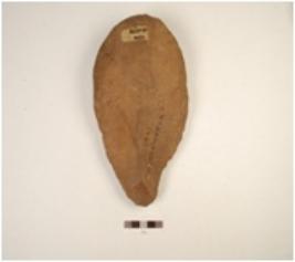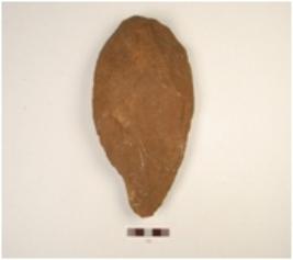 | Description / विवरण | A handaxe made on quartzite pebble, flake scars visible on both sides and cortex is visible at butt end. |