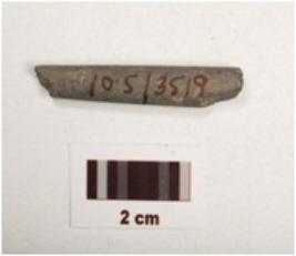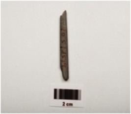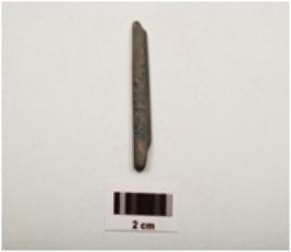 | Description / विवरण | A fragment of a point stone object, both ends broken, slightly chipped off from one side, black and grayish colour, square cross section. |