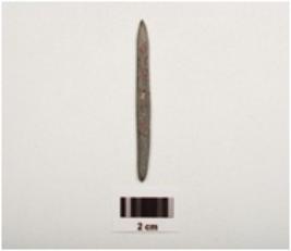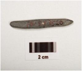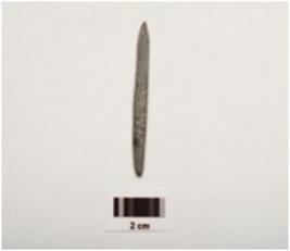 | Description / विवरण | A stone knitter both ends pointed but one end slightly chipped off, black and grayish in colour, with smooth and polished surface. |