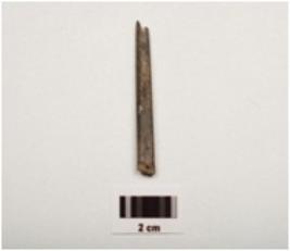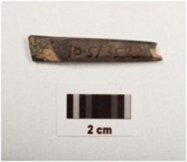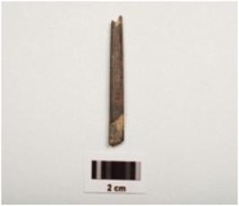 | Description / विवरण | A fragment of a point stone object, both ends broken, slightly chipped off, square cross section, black and grayish in colour, smoothly polished surface. |