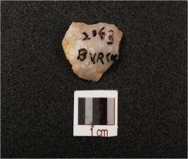 | Description / विवरण | A quartz end struck flake with flake scars on surface, prepared platform, diffused bulb on ventral and use-wear marks on edges. |