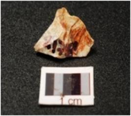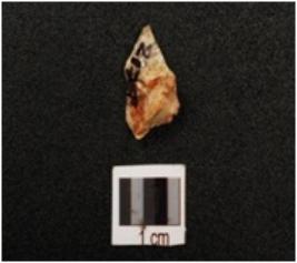 | Description / विवरण | A chert flake with a ridge on surface, prepared platform and pointed distal end. |