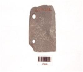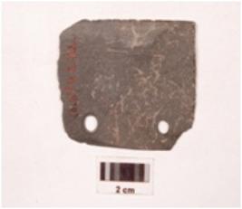 | Description / विवरण | A fragment of harvester made on basalt, two eye hole on edge, chipped off from surface, rectangular in shape. |
