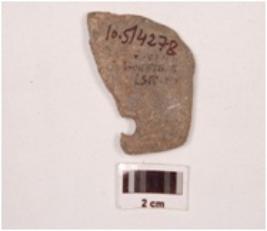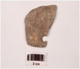 | Description / विवरण | A fragment of harvester made on basalt, uneven shape, surface is rough, an eye hole on edge. |