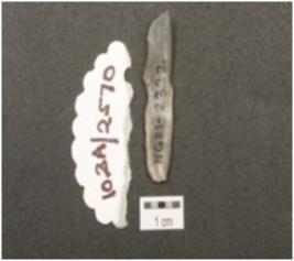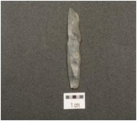 | Description / विवरण | A chalcedony blade with use marks along the cutting edges and trapezoidal cross-section. |