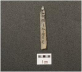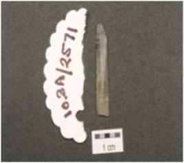 | Description / विवरण | A chalcedony blade with a mid-ridge on the dorsal surface, use marks along the cutting edge, triangular cross-section. |