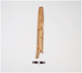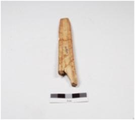 | Description / विवरण | A scraper made of bone, having one end with sharp edge, other end broken and well polished surface. |