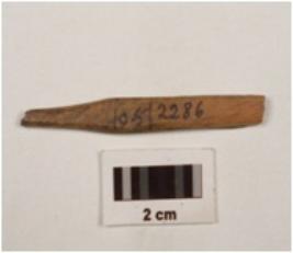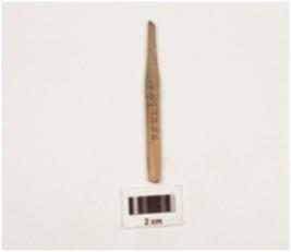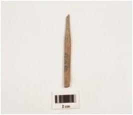 | Description / विवरण | Fragment of a bone point tapering towards pointed end, flat sides, rectangular in section, light brown in colour, broken along other end. |