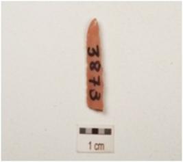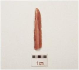 | Description / विवरण | Chert parallel sided blade with two prominent ridges on dorsal side, broken form proximal end, irregular retouches along at pointed distal end, use wear marks on cutting edge and trapezoidal in section. |