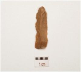 | Description / विवरण | Chert, parallel sided blade with a mid ridge on dorsal side, striking platform, diffused bulb on ventral side, irregular retouches on cutting edges and triangular in section. |