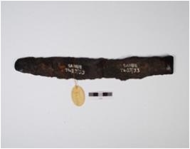 | Description / विवरण | Fragment of iron knife fragile condition and chemicaly treated rusted. |