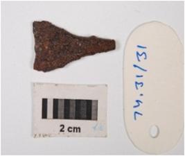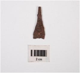| Description / विवरण | Iron fragment of knife projected head, broad base, rough surface and chemicaly treated. |