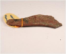 | Description / विवरण | A fragment of copper knife, mutilated in condition, remaining portion of knife is missing, cutting edges is visible. |