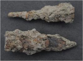 | Description / विवरण | Trench A, LxB-D 3.65 x 1.25 - 3.15 mbs at peg 1, Stratum layer 11 These are two pieces of broken iron arrow head. Surface is uneven and colour is brownish. It is badly rusted. |
