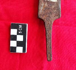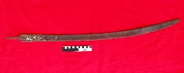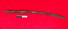 The iron sword is rusted yet in good condition. It has lightly curved blade. Having thickness of 5 mm Looking at the blade it seems there was a hilt attached to it, which is not with the sword.
