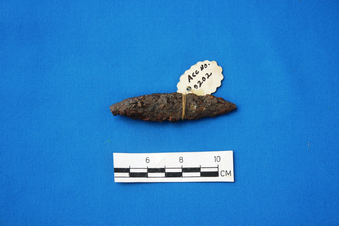 A head of on arrow with pointed tip and broken tang with a flattened section to be shot from the how either to hunt animal or to kill humanbeings.Rusted.Metallurgy technique has been used.