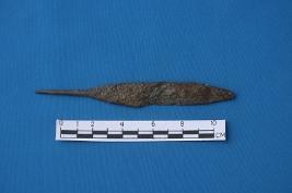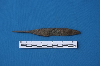 A head of on arrow with pointed tip and broken tang with a flattened section to be shot from the how either to hunt animal or to kill humanbeings.Rusted.Metallurgy technique has been used.