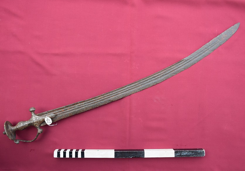 An iron long blade depicting grooves on its both sides is a weapan with decurative hilt showing inlaid wall, round base with inverted flower, provided with arched shaped gherd to kill . Rusted Metallurgy techinque used.