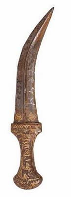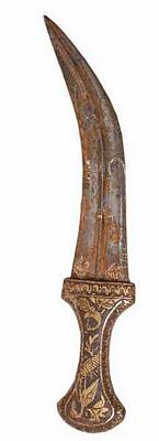 | Description / विवरण | Dashma with a decorative handle. Persian script is seen. Tiger chasing 2 deer on one side, 2 cranes are standing on another side of the handle. |