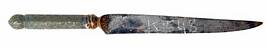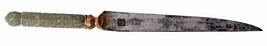| Description / विवरण | A long knife with decorative jade handle. Emblems are seen on top and bottom portions of the blade on one side. |