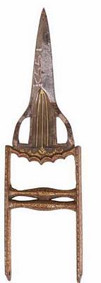 | Description / विवरण | A Katar Jamdhar having triangular blade with rectangle handle open on one side and joined at the middle. The blade is very thick with two cutting edges. It is so solid and stiff, it cannot bend and nothing will stop it. It is decorated with gold inlay work. |