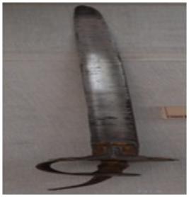 | Description / विवरण | Hilt inlaid with gold, furnished with knuckle guard & circular spiked pommel, straight grooved blade. |