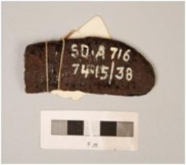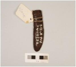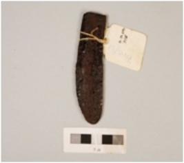 | Description / विवरण | Fragment of iron knife, partly broken, flat surface, U shaped top, cracks on surface, polished. |