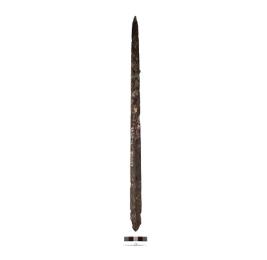 | Description / विवरण | Sward made of iron with a prominent tip and sharp edges, with a blade an surface, chemically treated object. |