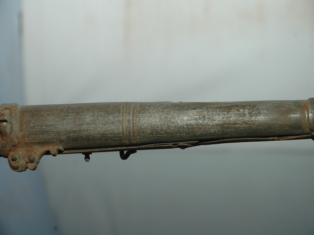A 18th century muzzle loading match lock gun with two rings engraved on the barrel of the gun. The muzzle loading rod is missing and the wooden butt is broken.