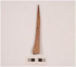 | Description / विवरण | A bone arrow head, surface is flat and crack on surface, one end is pointed, other end is broken and rectangular section, surface is smooth and polished. |